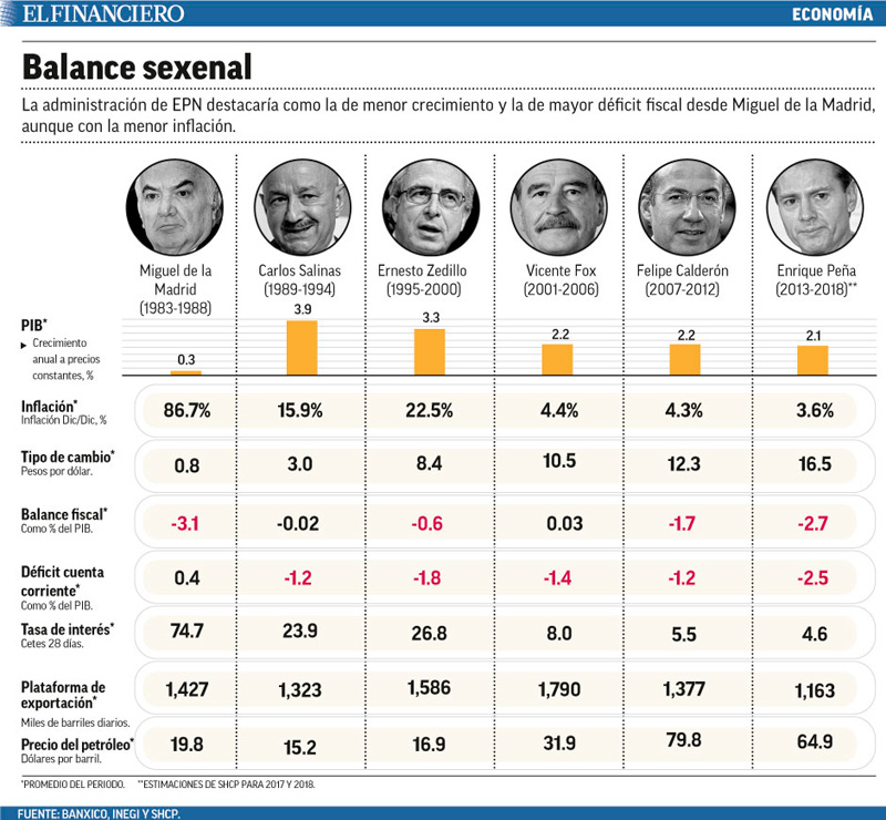Al cierre del sexenio del presidente Enrique Peña Nieto la economía habrá crecido en promedio 2.1 por ciento por año, el desempeño más bajo desde el sexenio de Miguel de la Madrid Hurtado.