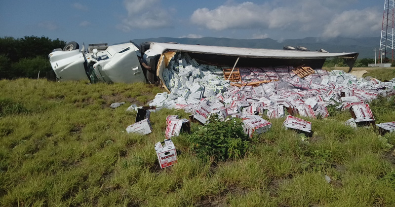 Trailero al equivocarse de ruta trata de redimir el error pero en la maniobra pierde el control y se recuesta. También transportaba alcachofa