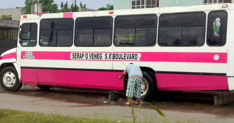 Los choferes aprovechan para lavar los autobuses o hacerle reparaciones