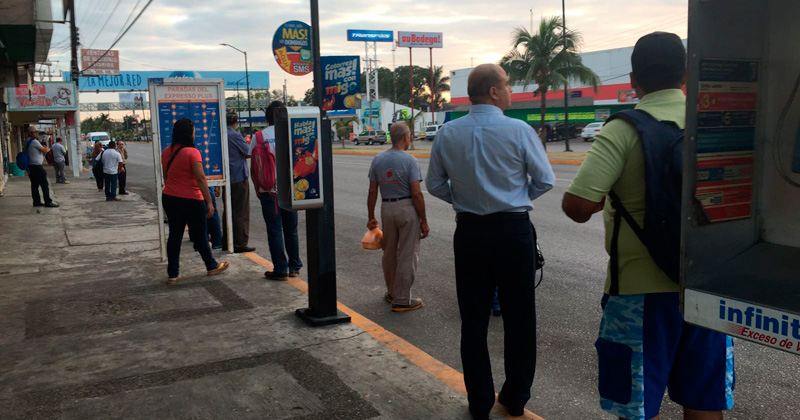 Esta es una fotografía de la colonia Borreguera en el norte de Tampico, donde alguna gente espera el transporte mientras que otros se va caminando o paga taxi para llegar a su trabajo.