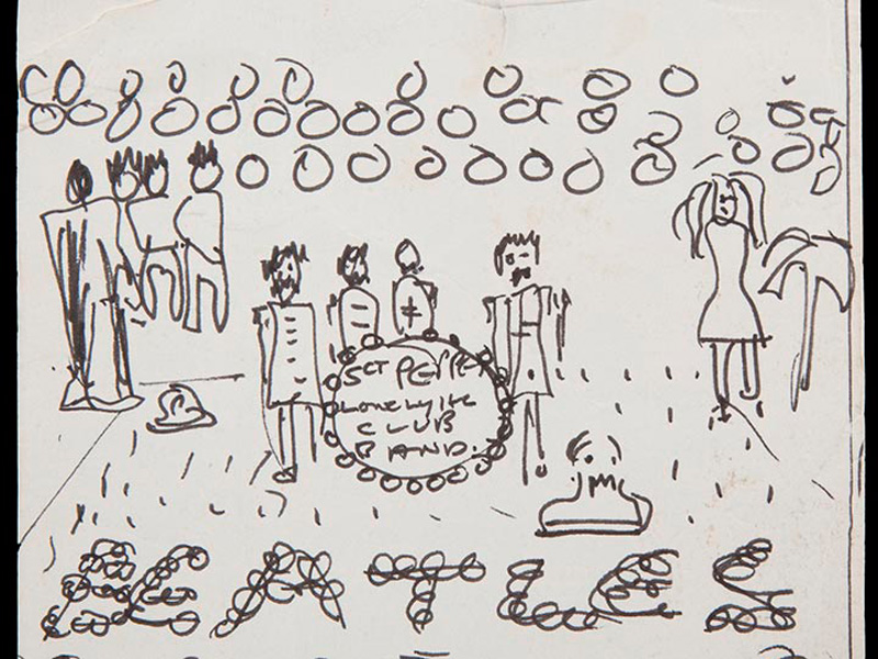 El dibujo es apenas un bosquejo de lo que sería la icónica portada del octavo álbum de estudio de la banda británica, donde aparecen los cuatro integrantes -John Lennon, Paul McCartney, Ringo Star y George Harrison- rodeados de celebridades como Marilyn Monroe, Marlon Brando, Bob Dylan, Oscar Wilde, Karl Marx, Edgar Allan Pooe y más.