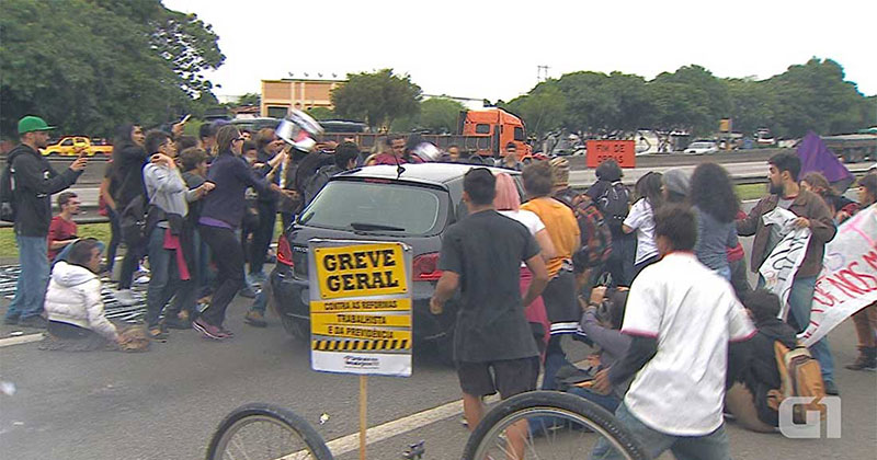 Un conductor impaciente se abre paso embistiendo a un grupo de personas que bloqueaba una carretera en Brasil