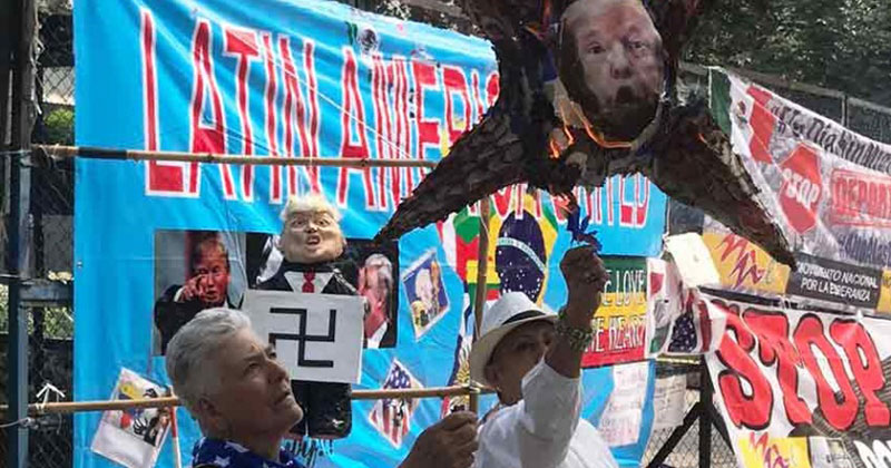 En la marcha del Día del Trabajo manifestantes incendiaron el lábaro patrio de ese país y una piñata con la imagen de Donald Trump