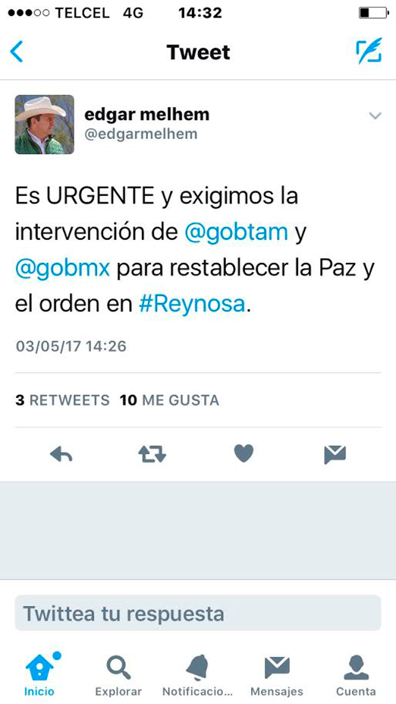 «Ha prevalecido una situación prácticamente de ingobernabilidad en Reynosa. Es urgente la presencia de más fuerzas federales y de la Fuerza Tamaulipas», afirmó el legislador.