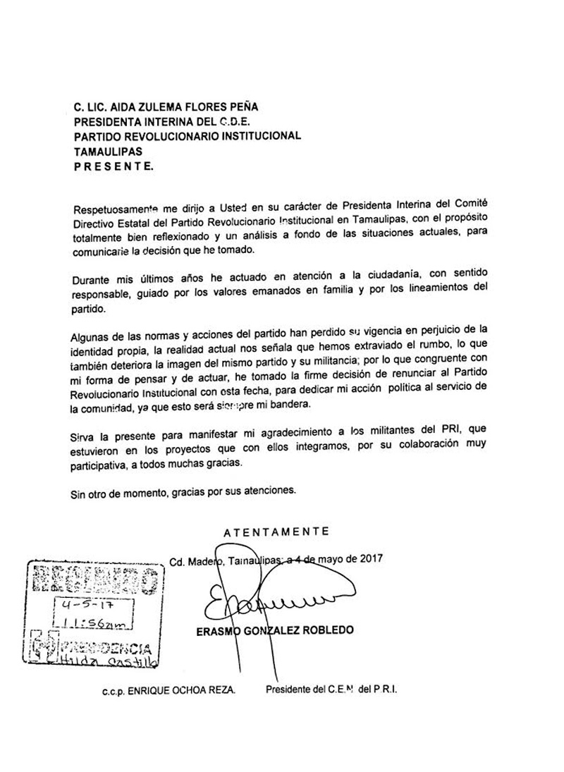 CIUDAD MADERO, Tamulipas.- El ex diputado local, Erasmo González Robledo presentó la mañana de este jueves su renuncia al Partido Revolucionario Institucional.