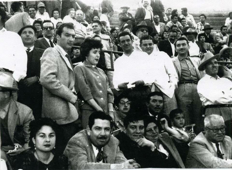 En plena corrida de toros, atentos a la faena, aparecen Carmelita Bringas, Pancho Benitez, don Florencio Bringas, Arquitecto Leduc, Laura Campo, Polín Argüello, Pepín Bringas, Juan Guerrero, Manino Zorrilla, Fernando Gutièrrez Saldívar y Leticia Gil Flores de Gutiérrez