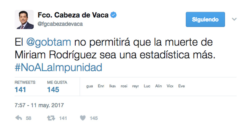 En un segundo mensaje señaló: “El @gobtam no permitirá que la muerte de Miriam Rodríguez sea una estadística más”.