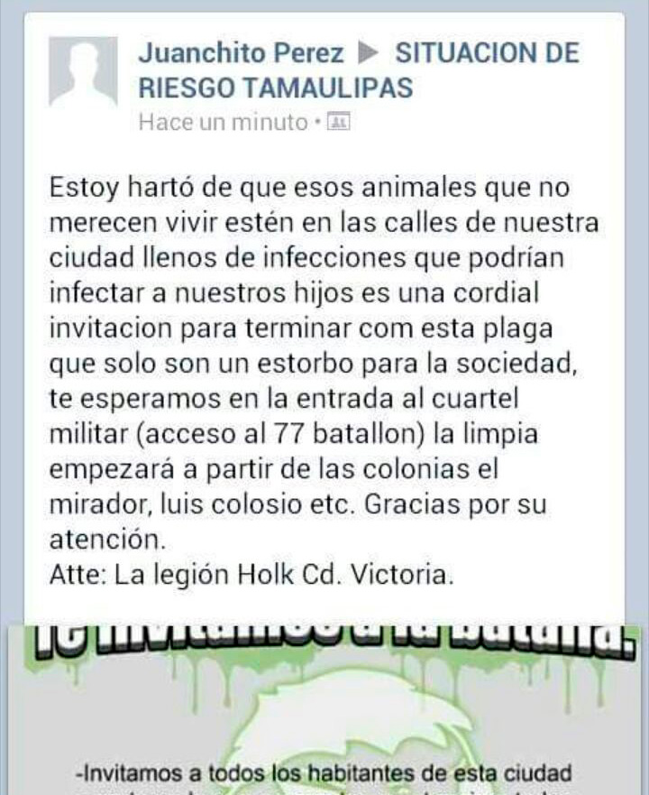 CIUDAD VICTORIA, Tamaulipas.- En un aviso difundido en redes, la ‘Legión Holk’ convoca a matar a todos los animales que se encuentren en la calle después de la medianoche.