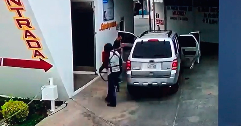 Se bajan dos sujetos fuertemente armados y entran al lobby de atención mientras que otro se queda afuera vigilando.