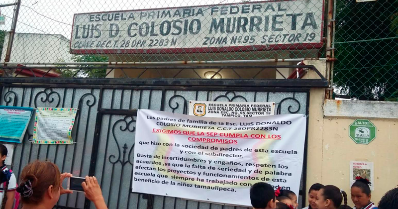 TAMPICO, Tamaulipas.- A gritos de “¡Queremos al director!, ¡Queremos al director!”, padres de familia de la escuela “Luis Donaldo Colosio Murrieta” ubicada en la colonia Insurgentes de la zona norte de Tampico, acaban de tomar las instalaciones de la primaria e impidieron que haya clases protestando contra la Secretaría de Educación Pública porque no tienen ni director ni subdirector.