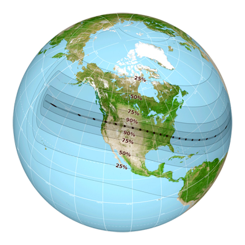 El eclipse solar será visible en gran parte de Norteamérica, especialmente en Estados Unidos donde se verá de un 75 hasta 90 por ciento; en Canadá entre 75 y 50 por ciento, y en México entre un 50 y 25 por ciento.
