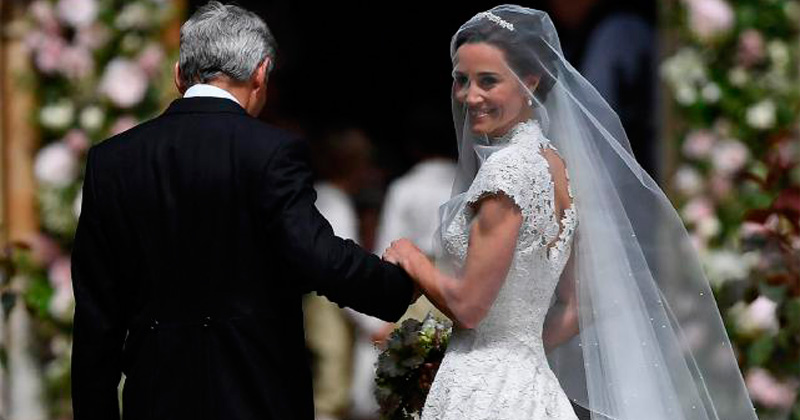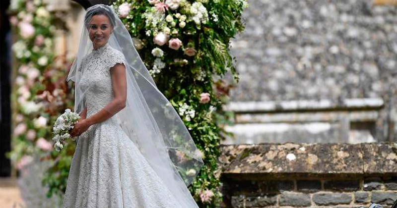 Hoy, en la que los medios consideran «la boda británica del año», la duquesa de Cambridge llevaba un vestido de manga larga en color rosa empolvado por debajo de la rodilla y escote de pico, acompañado de un tocado y zapatos del mismo tono. La esposa del príncipe Guillermo de Inglaterra ayudó a su hermana con el vestido a la entrada a la iglesia.