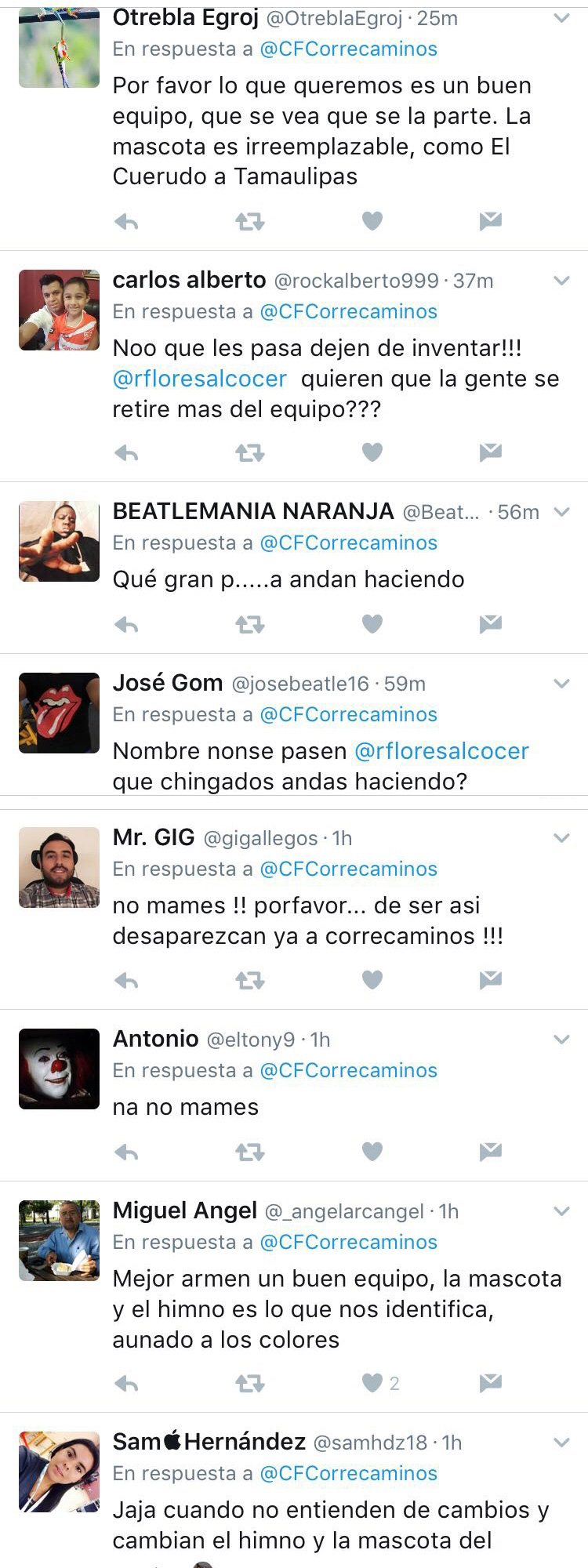 «Por favor lo que queremos es un buen equipo, que se vea que se la parte. La mascota es irreemplazable, como El Cuerudo a Tamaulipas», «Noo que les pasa dejen de inventar!!! @rfloresalcocer quieren que la gente se retire mas del equipo???», «Nombre nonse pasen @rfloresalcocer que chingados andas haciendo?» Y «El Correcaminos asi de maltrecho y corrupto tiene su historia propia. Regresenlo a 2a si desean. COMPRENSE OTRO EQUIPO».