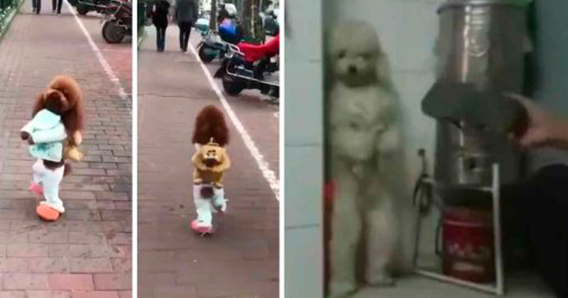 Para que los perritos puedan caminar erguidos son entrenados y maltratados hasta que logran mantenerse de pie