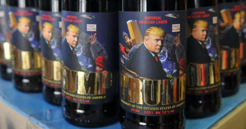 En la etiqueta de cada botella, el presidente estadounidense aparece frente a un muro, como el que prometió construir a lo largo de la frontera entre Estados Unidos y México.