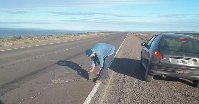 El hombre soportó frías temperaturas haciendo mezcla y tapando baches con el objetivo de prevenir accidentes automovilísticos