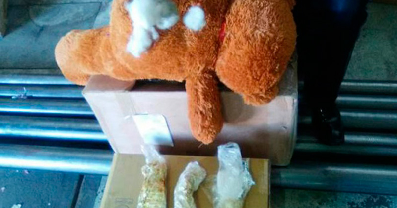Canes de la Policía Federal localizaron un oso de peluche relleno con paquetes de crystal, en una empresa de mensajería y paquetería, en Culiacán, Sinaloa
