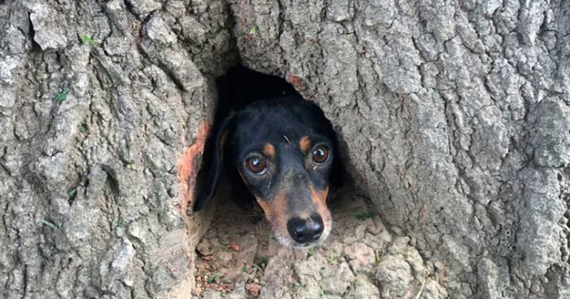 Un cachorro salchicha, persiguió una marmota y quedó atorado en el hoyo del tronco, por lo que tuvieron que cortar el tronco para sacarlo sano y salvo