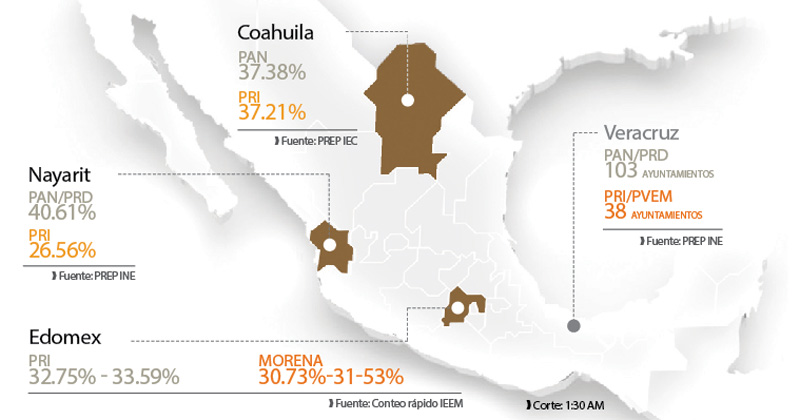 En el Estado de México la diferencia a favor de Alfredo del Mazo sería mínima, pero Morena también proclama su triunfo; en Coahuila, Nayarit y Veracruz aventaja