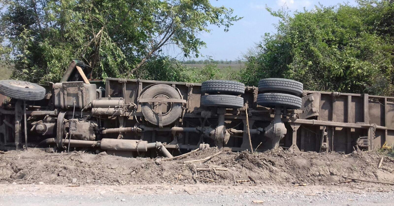 Al intentar esquivar un hoyo, el chofer de la pesada unidad viró bruscamente, perdiendo el control para después volcar