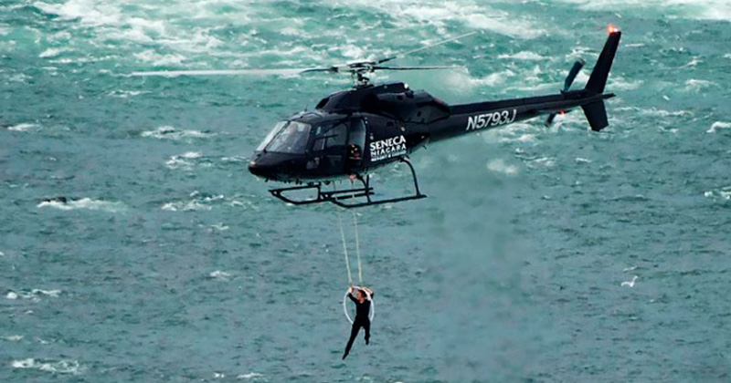 Wallenda, de 36 años, colgó de un par de cables que iban del helicóptero a un aro mediano. Quedó suspendida en el aire a unos 91 metros del agua. Mientras el viento agitaba el agua y la convertía en espuma, Wallenda hizo una serie de poses espectaculares, saludando a la gente en tierra mientras usaba el aro para colgarse de las piernas, pararse de manos y abrirse de piernas. Se colgó de los dientes dos veces, usando un protector bucal.