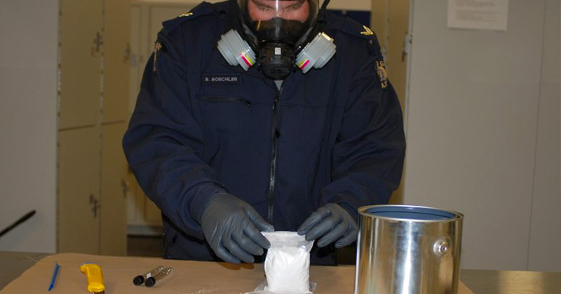 La página del Gobierno de Canadá Fentanyl Safety recomienda a los servicios de emergencia y seguridad no manipular jamás sustancias ilícitas desconocidas con las manos desnudas. Como mínimo, hay que llevar unos guantes gruesos y mascara dotada de filtros o, mejor aún, con purificador de aire.