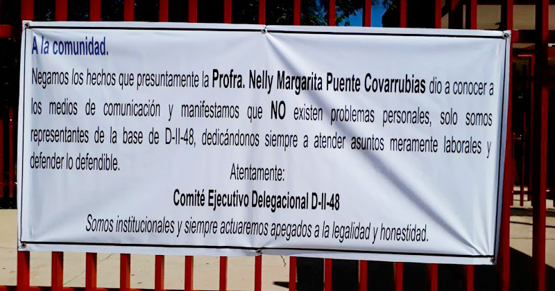 A través de la colocación de una manta al exterior del plantel, expusieron que “Negamos los hechos que presuntamente la Profra. Nelly Margarita Puente Covarrubias dio a conocer a los medios de comunicación y manifestamos que no existen problemas personales, solo somos representantes de la base de D-II-48, dedicándonos siempre a atender asuntos meramente laborales y defender lo defendible”.
