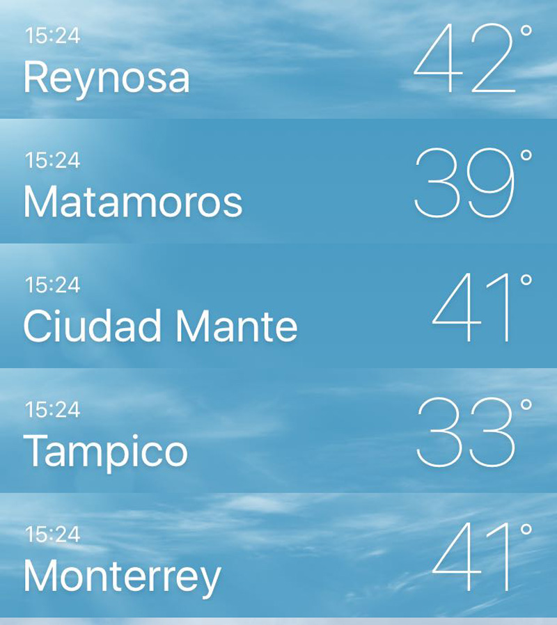 Mismas condiciones que se presentan en los municipios de Reynosa y Matamoros, que registran a las 15:30 horas una temperatura de 42 y 41 grados respectivamente.