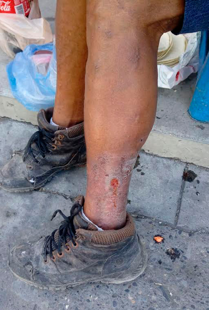 María de Jesús Ruiz Martínez, residente de la Colonia Enrique Lara, coloca un banco de plástico donde pasa las horas estirando las piernas reventadas por las varices y frente a ella su hijo, a quien no abandona y por quién sale a pedir la ayuda de los victorenses que ajetreados por la rutina diaria, algunos hacen alto para sacar una moneda del bolsillo y entregársela a doña «Marichuy».