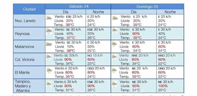 Así mismo se esperan temperaturas para el fin de semana máximas de 37 grados en Reynosa, mientras que en Victoria son de 34 y 31 para el sur, la zona cañera 35 y 36 en Matamoros.