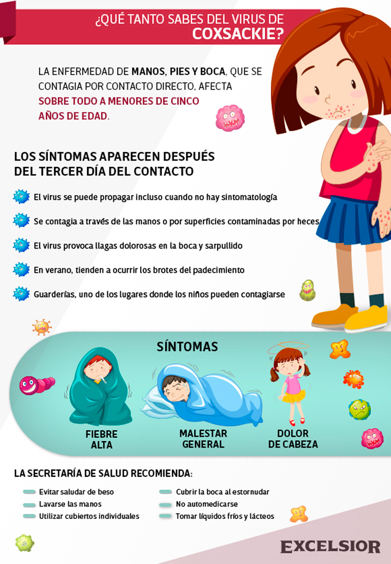 MÉXICO. Autoridades de Salud alertaron a padres de familia y maestros del Estado de México, Hidalgo y Tlaxcala, debido a la presencia de casos del virus del coxsackie, una enfermedad que afecta sobre todo a menores de cinco años de edad, provocándoles llagas en la boca y sarpullido.