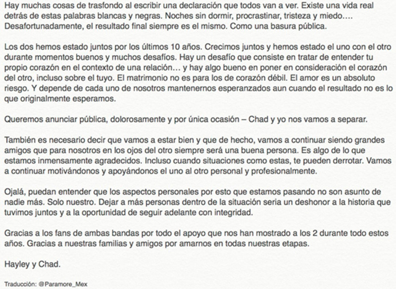 MÉXICO.- La cantante Hayley Williams y el guitarrista Chad Gilbert anunciaron su divorcio, causando revuelo en redes sociales y convirtiendo el tema en tendencia a los pocos minutos de hacerlo público.