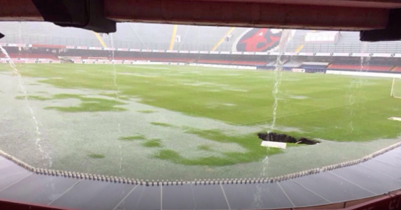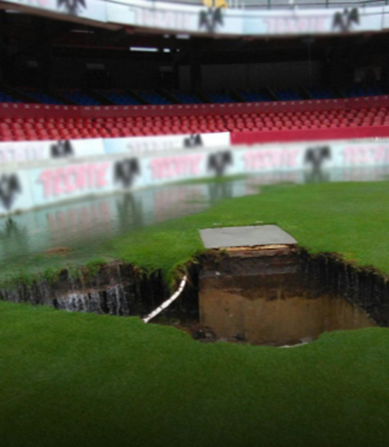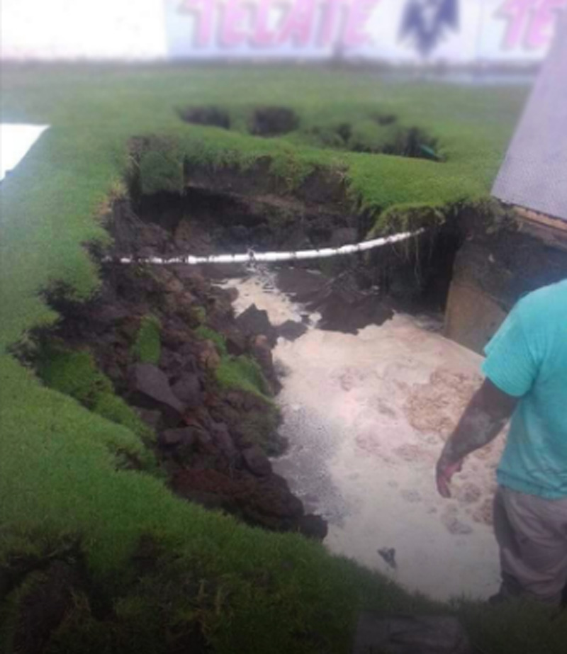 VERACRUZ.- Varias imágenes difundidas por redes sociales, muestran cómo las inclemencias del tiempo, aunado al mal drenaje, provocaron un socavón en el terreno de juego.