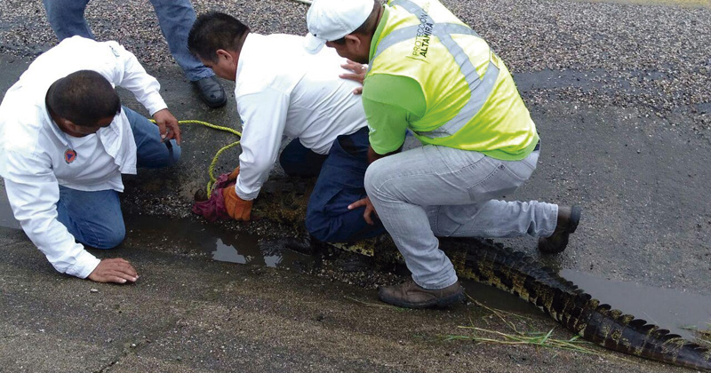 ALTAMIRA, Tamaulipas.- Un cocodrilo fue capturado en el Corredor Urbano «Luis Donaldo Colosio» en el tramo correspondiente al municipio de Altamira.