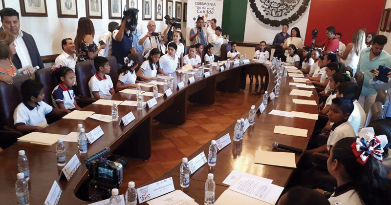 Como parte de la ceremonia ‘Un día en el Cabildo’, 30 menores acudieron a la presidencia municipal, usando el lugar del presidente y los regidores