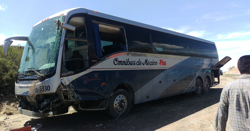 Hay tres heridos, son pasajeros y chofer del camión de ruta foránea. Aparentemente el autobús pega con un contenedor que se le había desprendido al tráiler