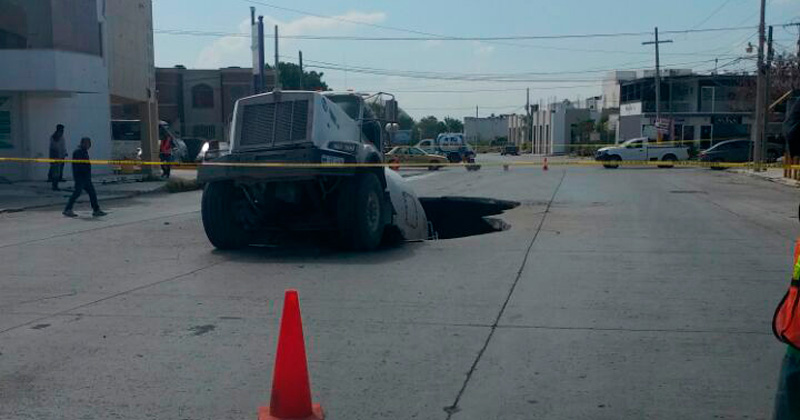 REYNOSA, Tamaulipas.- Un camión de la empresa concretos Tancol prácticamente se hundió en un socavón que se abrió en la avenida Río San Juan, en la colonia Fuentes Sección Lomas.