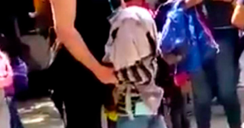 La mujer sujeta al menor de los brazos y le impide soltarse, mientras el pequeño tiene el rostro cubierto con un suéter y está llorando