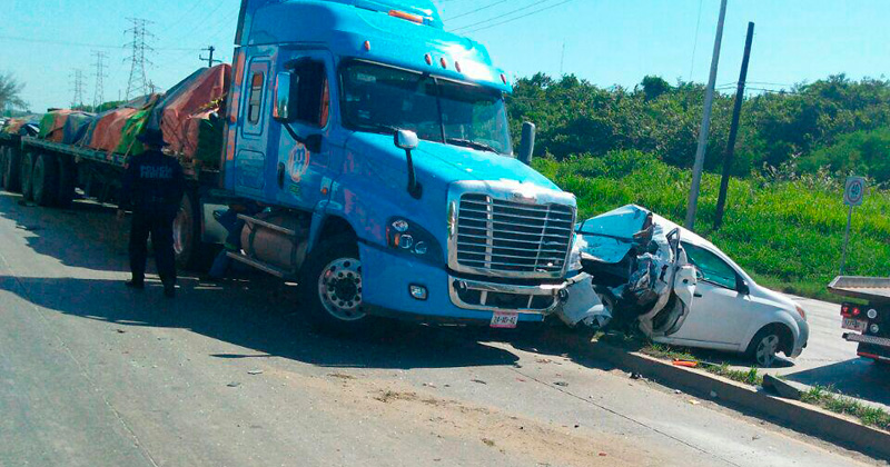 El trailer no pudo detener la marcha debido al exceso de velocidad e impactó al coche Aveo