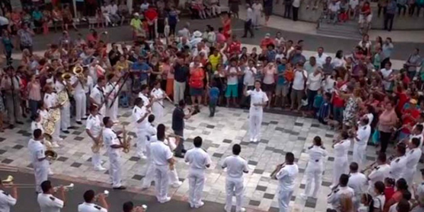 Integrantes de la orquesta sinfónica naval ‘aparecieron’ en el Zócalo de Veracruz para tocar ‘Cielito Lindo’