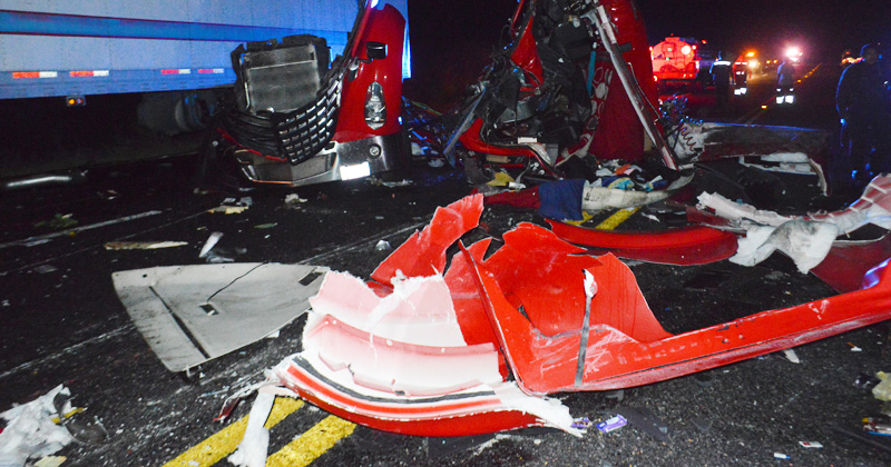 Sufre lesiones menores pese a que pulverizó el camión que tripulaba. Se estrella contra la parte trasera de otro tráiler que se hallaba parado en medio de la carretera