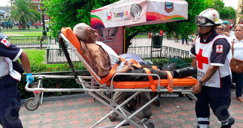 TAMPICO, Tamaulipas, Infortunado bolero que a diario desarrolla su oficio en la Plaza de la Libertad de Tampico, tras resentir el intenso calor registrado en la mañana de este sábado, sufrió un desmayo quedando tirado boca arriba a un lado de su lugar de trabajo, tras recibir el auxilio de manos de paramédicos de la Cruz Roja, fue trasladado hacia el hospital Carlos Canseco de Tampico.