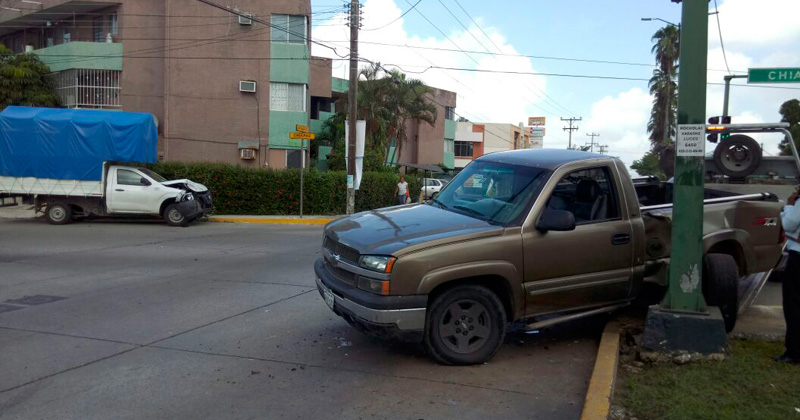 El conductor de una camioneta Chevrolet se pasó el alto que hay en el cruce de ambas vialidades y fue proyectada contra el semáforo por una camioneta tipo estaquitas, no se reportaron lesionados.