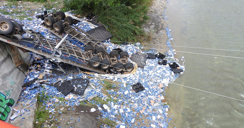 Plataforma cargada con miles de latas vuelca y cae del puente del río Comandante, dejando esparcida la carga que muy animosamente recogieron los lugareños