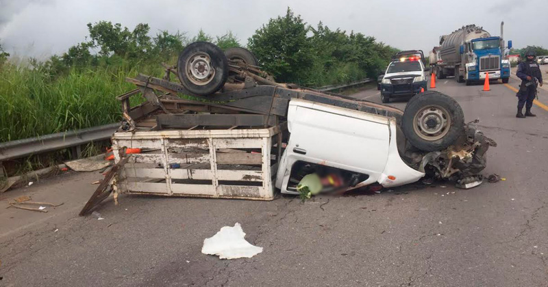 La camioneta siniestrada es una tipo estaquitas, misma que quedó volcada sobre la carretera, mueriendo en su interior el copiloto