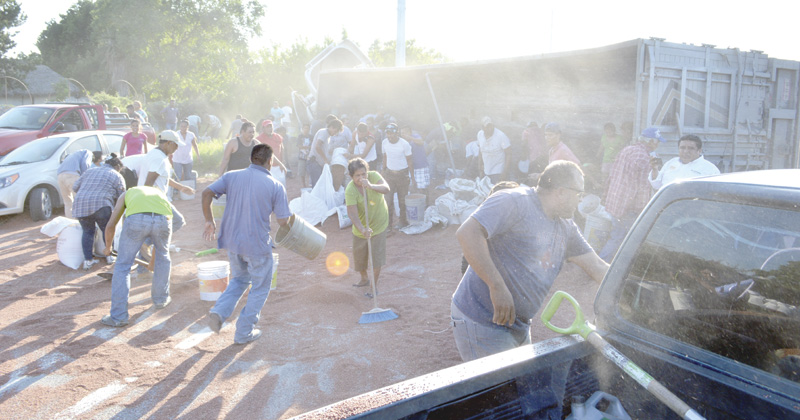 Habitantes de los ejidos Constitución del 17, San Juan y El Ranchito necesitaron únicamente de 30 minutos para vaciar 30 toneladas de sorgo de un tráiler que se volcó