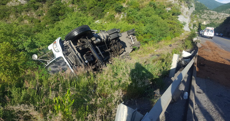 Trailero se queda dormido y embroca su unidad en una cuneta; por poco y se precipita a un barranco