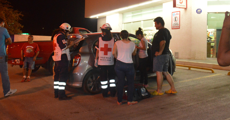 Camioneta se echa en reversa sin precaución y empuja la puerta de un auto compacto cuando descendía una tripulante; fue necesario su traslado a un centro hospitalario