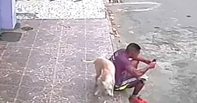 Un perrito tomó al hombre por sorpresa, mientras utilizaba su celular, y lo orinó en la espalda