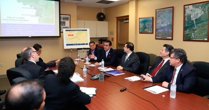 NUEVO LAREDO, Tam.- El presidente municipal, Enrique Rivas participó en una reunión celebrada en Laredo, Texas; con el subsecretario para América del Norte, Carlos Manuel Sada Solana y el congresista Henry Cuellar, donde se presentaron los planes para modernizar el Puente del Comercio Mundial y las carreteras e infraestructura contigua.